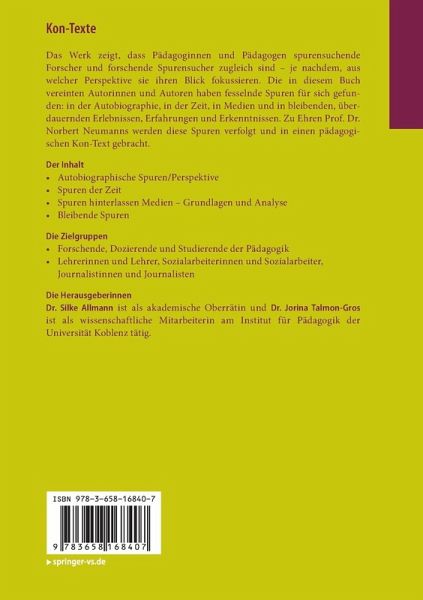 Das Werk zeigt, dass Pädagoginnen und Pädagogen spurensuchende Forscher und forschende Spurensucher zugleich sind - je nachdem, aus welcher Perspektive sie ihren Blick fokussieren. Die in diesem Buch vereinten Autorinnen und Autoren haben fesselnde Spuren für sich gefunden: in der Autobiographie, in der Zeit, in Medien und in bleibenden, überdauernden Erlebnissen, Erfahrungen und Erkenntnissen. Zu Ehren Prof. Dr. Norbert Neumanns werden diese Spuren verfolgt und in einen pädagogischen Kon-Text gebracht.