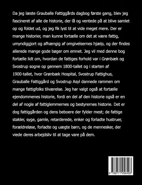 Da jeg læste Grauballe Fattiggårds dagbog første gang, blev jeg fascineret af alle de historier, der lå og ventede på at blive samlet op og foldet ud, og jeg fik lyst til at vide meget mere. Der er mange historier, man kunne fortælle om det at være fattig, umyndiggjort og afhængig af omgivelsernes hjælp, og der findes allerede mange gode bøger om emnet. Jeg vil med denne bog fortælle lidt om, hvordan de fattiges forhold var i Grønbæk og Svostrup sogne op gennem 1800-tallet og i starten af 1900-tallet, hvor Grønbæk Hospital, Svostrup Fattighus, Grauballe Fattiggård og Svostrup Asyl dannede rammen om mange fattigfolks tilværelse. Jeg har valgt også at fortælle ejendommenes historie, fordi en del af den historie også er en del af nogle af fattiglemmernes og bestyrernes historie. Det er dog fattiggården og dens beboere der fylder mest; de fattige stakler, syge, gamle, retarderede, enker og forladte hustruer, forældreløse, forladte og uægte børn, og de mennesker, der viede deres arbejdsliv til at tage vare på dem.