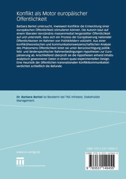 Barbara Berkel untersucht, inwieweit Konflikte die Entwicklung einer europäischen Öffentlichkeit stimulieren können. Die Autorin baut auf einem liberalen Verständnis massenmedial hergestellter Öffentlichkeit auf und unterstellt, dass sich ein Prozess der Europäisierung nationaler Öffentlichkeiten im Rahmen von Politikfeldern vollzieht. Aus einer konflikttheoretischen und kommunikationswissenschaftlichen Analyse des Phänomens Öffentlichkeit leitet sie unter Berücksichtigung politikfeld- und länderspezifischer Rahmenbedingungen Hypothesen zur Europäisierung ab. Anschließend überprüft sie die Hypothesen anhand inhaltsanalytisch gewonnener Daten in einem quasi-experimentellen Design. Eine Heuristik der öffentlichen transnationalen Konfliktkommunikation verdichtet schließlich die Befunde.