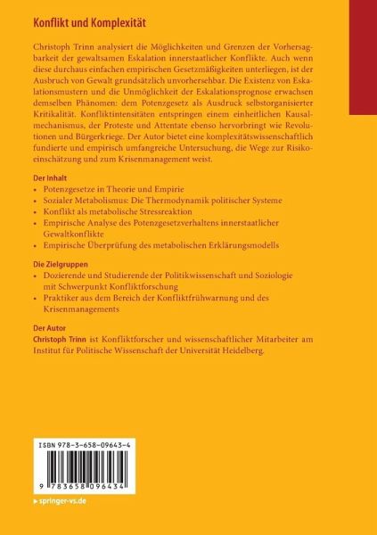 Christoph Trinn analysiert die Möglichkeiten und Grenzen der Vorhersagbarkeit der gewaltsamen Eskalation innerstaatlicher Konflikte. Auch wenn diese durchaus einfachen empirischen Gesetzmäßigkeiten unterliegen, ist der Ausbruch von Gewalt grundsätzlich unvorhersehbar. Die Existenz von Eskalationsmustern und die Unmöglichkeit der Eskalationsprognose erwachsen demselben Phänomen: dem Potenzgesetz als Ausdruck selbstorganisierter Kritikalität. Konfliktintensitäten entspringen einem einheitlichen Kausalmechanismus, der Proteste und Attentate ebenso hervorbringt wie Revolutionen und Bürgerkriege. Der Autor bietet eine komplexitätswissenschaftlich fundierte und empirisch umfangreiche Untersuchung, die Wege zur Risikoeinschätzung und zum Krisenmanagement weist.
