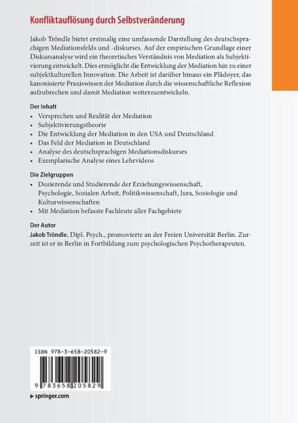 Jakob Tröndle bietet erstmalig eine umfassende Darstellung des deutschsprachigen Mediationsfelds und -diskurses. Auf der empirischen Grundlage einer Diskursanalyse wird ein theoretisches Verständnis von Mediation als Subjektivierung entwickelt. Dies ermöglicht die Entwicklung der Mediation hin zu einer subjektkulturellen Innovation. Die Arbeit ist darüber hinaus ein Plädoyer, das kanonisierte Praxiswissen der Mediation durch die wissenschaftliche Reflexion aufzubrechen und damit Mediation weiterzuentwickeln.