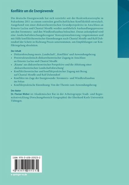 Die deutsche Energiewende hat sich verstärkt seit der Reaktorkatastrophe in Fukushima 2011 zu einem zentralen gesellschaftlichen Konfliktfeld entwickelt. Ausgehend von einer diskurstheoretischen Grundperspektive in Anschluss an Ernesto Laclau und Chantal Mouffe werden ausführlich Aushandlungsprozesse um den Stromnetz- und den Windkraftausbau beleuchtet. Daran anknüpfend wird eine ,landschaftsforschungsbezogene' Konzeptionalisierung vorgenommen und mit Hilfe konflikttheoretischer Einordnungen nach Chantal Mouffe und Ralf Dahrendorf der Schritt in Richtung Praxis unternommen, um Empfehlungen zur Konfliktregelung abzuleiten.