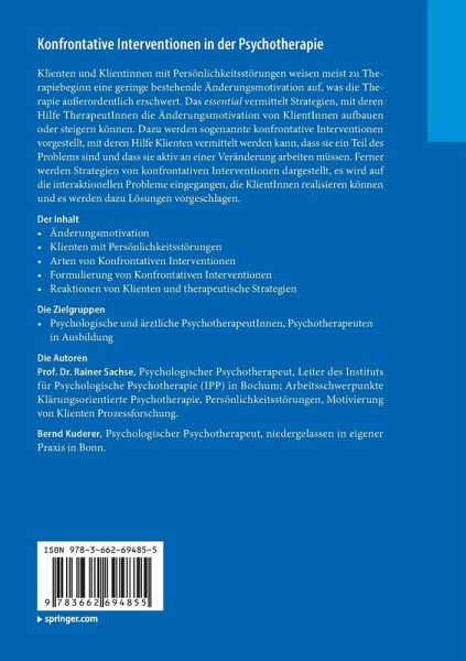 Klienten und Klientinnen mit Persönlichkeitsstörungen weisen meist zu Therapiebeginn eine geringe bestehende Änderungsmotivation auf, was die Therapie außerordentlich erschwert. Das essential vermittelt Strategien, mit deren Hilfe TherapeutInnen die Änderungsmotivation von KlientInnen aufbauen oder steigern können. Dazu werden sogenannte konfrontative Interventionen vorgestellt, mit deren Hilfe Klienten vermittelt werden kann, dass sie ein Teil des Problems sind und dass sie aktiv an einer Veränderung arbeiten müssen. Ferner werden Strategien von konfrontativen Interventionen dargestellt, es wird auf die interaktionellen Probleme eingegangen, die KlientInnen realisieren können und es werden dazu Lösungen vorgeschlagen.
