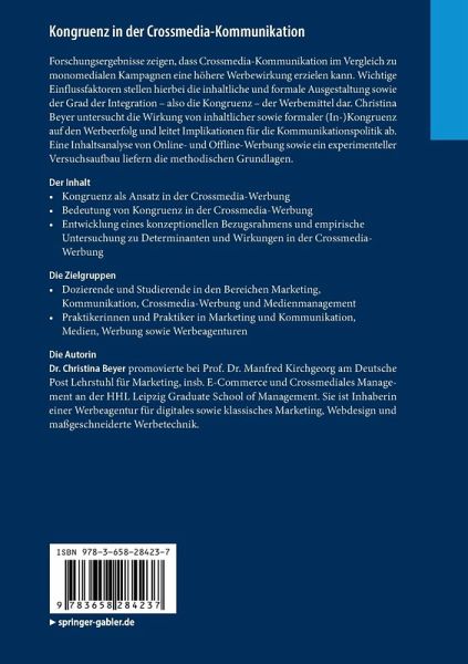 Forschungsergebnisse zeigen, dass Crossmedia-Kommunikation im Vergleich zu monomedialen Kampagnen eine höhere Werbewirkung erzielen kann. Wichtige Einflussfaktoren stellen hierbei die inhaltliche und formale Ausgestaltung sowie der Grad der Integration - also die Kongruenz - der Werbemittel dar. Christina Beyer untersucht die Wirkung von inhaltlicher sowie formaler (In-)Kongruenz auf den Werbeerfolg und leitet Implikationen für die Kommunikationspolitik ab. Eine Inhaltsanalyse von Online- und Offline-Werbung sowie ein experimenteller Versuchsaufbau liefern die methodischen Grundlagen