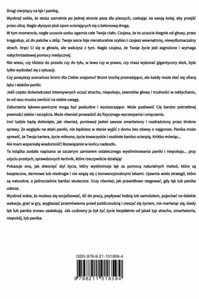 Drogi cierpi¿cy na l¿k i panik¿, Wyobrä sobie, ¿e stoisz samotnie po jednej stronie pasa dla pieszych, czekaj¿c na swoj¿ kolej, aby przej¿¿ przez ulic¿. Nagle s¿yszysz pisk opon ocieraj¿cych si¿ o betonow¿ drog¿. W tym momencie, nag¿e uczucie szoku ogarnia cäe Twoje ciäo. Czujesz, ¿e to uczucie biegnie od g¿owy, przez kr¿gos¿up, ä do palców u stóp. Twoje serce bije nienaturalnie szybko i czujesz wewn¿trzny, niewyt¿umaczalny strach. Kr¿ci Ci si¿ w g¿owie, ale walczysz z tym. Nagle czujesz, ¿e Twoje ¿ycie jest zagröone i wymaga natychmiastowej pomocy medycznej. Nie wiesz, czy idziesz do przodu czy do ty¿u, w lewo czy w prawo, czy masz wykonä gigantyczny skok, byle tylko wydostä si¿ z sytuacji. Czy powy¿szy scenariusz brzmi dla Ciebie znajomo? Brzmi troch¿ przeräaj¿co, ale kädy möe stä si¿ ofiar¿ l¿ku i ataków paniki. Je¿li cz¿sto döwiadczasz intensywnych uczü strachu, niepokoju, zawrotów g¿owy i trudnöci w oddychaniu, to od razu musisz zwróci¿ na siebie uwag¿. Zaburzenia l¿kowo-paniczne mog¿ by¿ paskudne i wyniszczaj¿ce. Möe pozbawi¿ Ci¿ bardzo potrzebnej pewnöci siebie i szcz¿¿cia. Möe równie¿ prowadzi¿ do fizycznego wyczerpania i zm¿czenia. Inni ludzie b¿d¿ dotkni¿te, jak równie¿, poniewä jeste¿ zawsze zmartwiony i rozdräniony przez drobne sprawy. Ze wzgl¿du na ataki paniki, nie b¿dziesz w stanie wyj¿¿ z domu bez obawy o najgorsze. Panika möe sprawi¿, ¿e Twoja kariera, ¿ycie mi¿osne, ¿ycie towarzyskie i osobiste bardzo ucierpi¿. Krótko mówi¿c. Ale mam wspaniä¿ wiadomö¿! Rozwi¿zanie w köcu nadesz¿o. Ta ksi¿¿ka zostäa napisana ze szczerym zamiarem ostatecznego wyeliminowania paniki i niepokoju; przy üyciu prostych, sprawdzonych technik, które rzeczywi¿cie dziäaj¿! Pokazuje ona, jak stworzy¿ styl ¿ycia, który wyeliminuje l¿k za pomoc¿ naturalnych metod, które s¿ bezpieczne, darmowe lub niedrogie i nie wi¿¿¿ si¿ z konwencjonalnymi lekami. Ujawnia wiele strategii, które s¿ naturalne, a jednocze¿nie bardzo skuteczne.