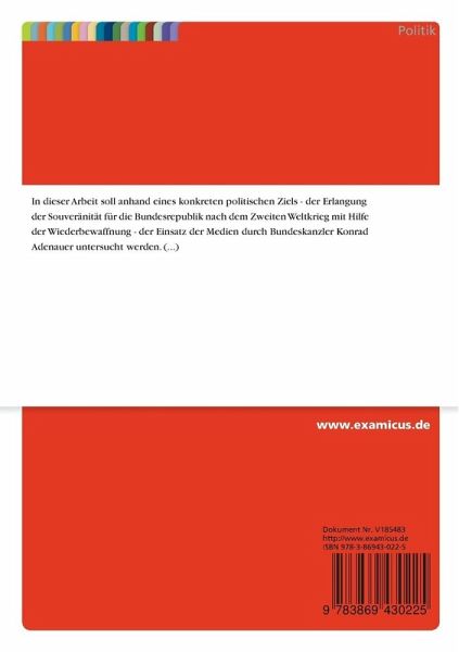Magisterarbeit aus dem Jahr 1996 im Fachbereich Politik - Politische Systeme - Historisches, Note: 1, Rheinische Friedrich-Wilhelms-Universität Bonn, Sprache: Deutsch, Abstract: In dieser Arbeit soll anhand eines konkreten politischen Ziels - der Erlangung der Souveränität für die Bundesrepublik nach dem Zweiten Weltkrieg mit Hilfe der Wiederbewaffnung - der Einsatz der Medien durch Bundeskanzler Konrad Adenauer untersucht werden. Ist es ei nem Politiker möglich, durch Zeitpunkt, Art und Weise der Mediennut zung, seine gewünschten Adressaten, in diesem Fall die Regierungen der Alliierten und die Meinung der Öffentlichkeit, in seinem Sinne zu errei chen? Und welche journalistische Form ist dabei die sinnvollste?