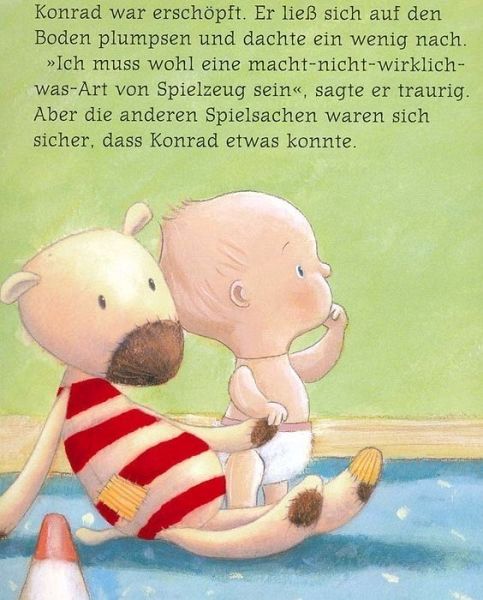 Da ist ein Neuer im Kinderzimmer! Er heißt Konrad und er ist klein, weich und trägt einen rot-weiß-gestreiften Anzug. Aber was für ein Spielzeug ist er bloß? Was kann er, was die anderen nicht können? Konrad ist verwirrt und traurig. Bis ihm die anderen Spielsachen helfen, herauszufinden, wer er ist.