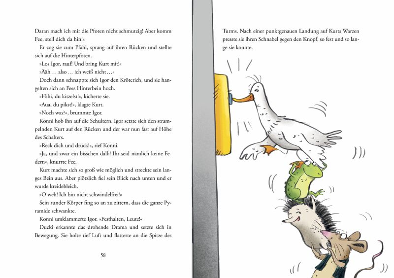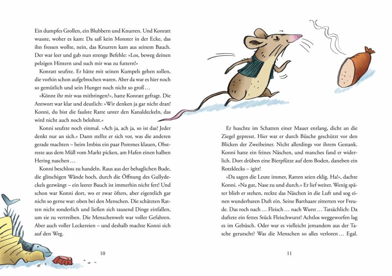 In „Konratt Held der Unterwelt“ tingeln sich eine Menge bunter, origineller Figuren. Allen voran natürlich Konratt, „die faulste Ratte unter den Kanaldeckeln“, die ganz schön viel weiß, die untypischerweise Wasser hasst und unter einem starken Helfersyndrom leidet. Der Verstand wird dabei von Konratts Herz immer wieder besiegt und Konratt kann einfach nicht anders, als in Not geratenen Tieren zu helfen. Ein echt charismatischer Held wider Willen! Auch die anderen Tiere sind besondere Persönlichkeiten, wie z.B. Fee, die sich nach außen hin arrogant und „etepetete“ gibt, aber trotzdem einen weichen Kern hat, die engagierte Umweltaktivistin Ente Ducki oder Kurt, die ängstlichste Kröte weit und breit. Dass die Tiere so extrem unterschiedlich sind, führt zu witzigen Situationen und Wortgefechten. Wichtige Themen wie soziales Miteinander, Tier- oder Umweltschutz werden durch die einzelnen Figuren nebenbei und ganz zwanglos angesprochen, ohne dass das gewollt oder verkrampft wirkt.