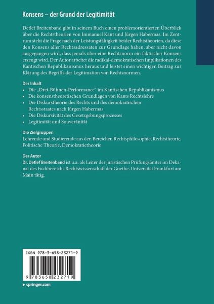 Detlef Breitenband gibt in seinem Buch einen problemorientierten Überblick über die Rechtstheorien von Immanuel Kant und Jürgen Habermas. Im Zentrum steht die Frage nach der Leistungsfähigkeit beider Rechtstheorien, da diese den Konsens aller Rechtsadressaten zur Grundlage haben, aber nicht davon ausgegangen wird, dass jemals über eine Rechtsnorm ein faktischer Konsens erzeugt wird. Der Autor arbeitet die radikal-demokratischen Implikationen des Kantischen Republikanismus heraus und leistet einen wichtigen Beitrag zur Klärung des Begriffs der Legitimation von Rechtsnormen.