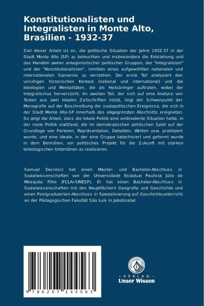 Ziel dieser Arbeit ist es, die politische Situation der Jahre 1932-37 in der Stadt Monte Alto (SP) zu beleuchten und insbesondere die Entstehung und das Handeln zweier antagonistischer politischer Gruppen, der "Integralisten" und der "Konstitutionalisten", inmitten eines aufgewühlten nationalen und internationalen Szenarios zu verstehen. Der erste Teil analysiert den unruhigen historischen Kontext (national und international) und die Ideologien und Mentalitäten, die als Heilsbringer auftraten, wobei der Integralismus hervorsticht. Im zweiten Teil, der sich auf eine Analyse von Texten aus zwei lokalen Zeitschriften stützt, liegt der Schwerpunkt der Monografie auf der Beschreibung der soziopolitischen Ereignisse, die sich in der Stadt Monte Alto-SP innerhalb des abgegrenzten Abschnitts ereigneten. So zeigt die Arbeit, dass die lokale Politik eine ambivalente Situation hatte, in der reale Politik stattfand, die im demokratischen politischen Spiel auf der Grundlage von Parteien, Repräsentation, Debatten, Wahlen usw. praktiziert wurde, und eine ideale, in der eine Gruppe katechisiert und geformt wurde in dem Bemühen, ein politisches Projekt für die Zukunft mit starken teleologischen Untertönen zu realisieren.