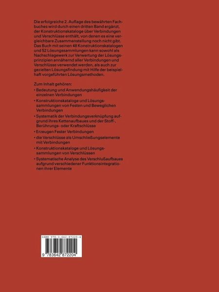 Die erfolgreiche 2. Auflage des bewährten Fachbuches wird durch einen dritten Band ergänzt, in dem in gleicher Darstellungsweise wie in den beiden ersten Bänden Verbindungen und Verschlüsse vertieft behandelt werden. Eine vergleichbare Zusammenstellung dieser Konstruktionselemente als systematisch gegliedertes Arbeitsmittel für den Konstrukteur gibt es nicht. Mit diesem dritten Band wird das Werk Konstruieren mit Konstruktionskatalogen noch wertvoller für jeden Konstrukteur.