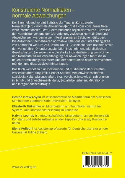 Der Sammelband vereint Beiträge der Tagung "Konstruierte Norm[alität][en] - normale Abweichung[en]", die vom Konstanzer Netzwerk internationaler (Post-)Doktorandinnen organisiert wurde. Prozesse der Normbildungen und der Grenzziehung zwischen Normalitäten und Abweichungen werden in vier interdisziplinären Sektionen diskutiert. Die AutorInnen thematisieren normative Relationalität und Abhängigkeit von Kontexten wie Ort, Zeit, Raum, Kultur, Geschlecht oder Tradition sowie den Verlust ihrer Orientierungsfunktion in zunehmend pluralistischen Gesellschaften. Sie zeigen, wie die starke Individualisierung von Normen und Normalitäten zur Vervielfältigung der Abweichungen führt, die in neuen Normbildungsprozessen und der Konstruktion neuer Normalitäten münden und diese zugleich hinterfragen. Das Buch wendet sich an Dozierende und Studierende der Literaturwissenschaften, Linguistik, Gender Studies, Medienwissenschaften, Soziologie, Kulturwissenschaften, BWL, Psychologie sowie an LehrerInnen in Schul- und Erwachsenenbildung, SozialarbeiterInnen, Migrations- und Integrationsbeauftragte.