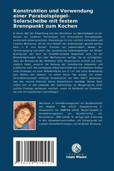 In dieser Welt der Entwicklung und des Bemühens um Nachhaltigkeit ist der Einsatz von sauberen Technologien und erneuerbaren Energiequellen zunehmend vielversprechend. Solarenergie ist eine reichlich vorhandene und saubere Ressource, die für eine Vielzahl von Anwendungen genutzt werden kann, z. B. zum Kochen, Trocknen von Lebensmitteln, Heizen, zur Stromerzeugung und mehr. Der parabolische Solarkonzentrator mit festem Brennpunkt, der auch als Scheffler-Scheibe bezeichnet wird, ist ein Konzentratormodell, das über Mechanismen verfügt, die es ermöglichen, dass der Brennpunkt des Reflektors hohe Temperaturen erreicht und stets statisch bleibt, wodurch die Nutzung der Solarthermie bequemer und praktischer wird. Die vorliegende Arbeit beschreibt den schrittweisen Aufbau eines Prototyps mit einer Reflektorfläche von 2,7 m² und seine Verwendung zum Kochen von Speisen. An einem klaren Tag wurden mit einem Infrarotthermometer sofortige Temperaturen von über 500°C gemessen, was das enorme Potenzial dieses Konzentrators bestätigt. Dieses Buch richtet sich an alle Liebhaber der Solarenergie, an Neugierige,die einen solchen Prototyp nachbauen möchten, sowie an Fachleute und Studenten, die sich mit Solarkochern beschäftigen.