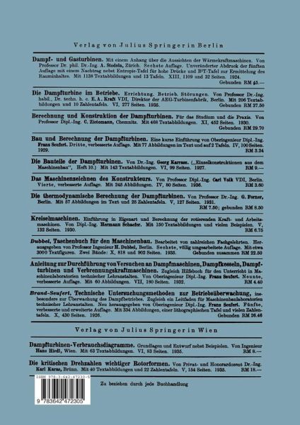 A. Axialturbinen.- I. Düsen und Leitschaufeln.- II. Leiträder (Zwischenböden).- III. Laufschaufeln.- IV. Schaufelbefestigungen und Schaufelschlösser.- V. Abdichtungen an Schaufeln.- VI. Nabenabdichtungen (Innenstopfbüchsen).- VII. Entwässerung an der Nederdruckschaufelung.- VIII. Läufer.- IX. Außenstopfbüchsen.- X. Lager und Lagerstuhl.- XI Kupplungen und Getriebe.- XII. Gehäuse.- XIII. Fundamentrahmen.- XIV. Regelung.- XV. Regelungseinzelheiten.- XVI. Kleinturbinen.- XVII. Kondensationsturbinen mittlerer und großer Leistung.- XVIII. Gegendruck- und Vorschaltturbinen.- XIX. Entnahmeturbinen.- XX. Schiffsturbinen.- B. Radialturbinen.- XXI. Ljungströmturbine (Gegenlaufturbine).- XXII Siemens Einfach-Radialturbine.