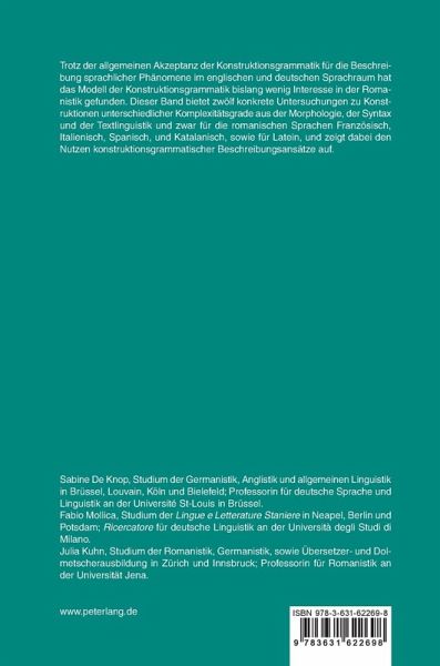 Inhalt: Sabine De Knop/Fabio Mollica: Konstruktionsgrammatik für die Beschreibung romanischer Sprachen - Cosima Scholz: El correpasillos oder warum romanische Bobbycars gute Konstruktionen sind - Livio Gaeta: Ecco, ecco, l'ho trovata: La tenace persistenza di un'impalcatura cognitiva primaria - Corina Petersilka: Reflexivität im Französischen aus konstruktionsgrammatischer Sicht - Sabine De Knop: Eine Untersuchung von Kausalkonstruktionen mit Farbbezeichnungen im Rahmen der Konstruktionsgrammatik - Paul Sambre: Usare strumenti: la cause constructionnelle de l'instrumentalité en italien - Anja Hennemann: Die Funktionen der Konstruktion X de que Y - Francisco Gonzálvez-García: Breves consideraciones en torno a la interacción entre coerción y polisemia: El caso de la predicación secundaria con verbos de cognición en español - Francisco José Ruiz de Mendoza Ibáñez/María del Pilar Agustín Llach: La construcción reduplicativa de base léxica en español: un estudio preliminar para estudiantes de español como L2 - Fabio Mollica/Julia Kuhn: Konstruktionen mit freiem Dativ in der Konstruktions- und Valenzgrammatik - Rembert Eufe: Verba Dicendi im Gebrauch: Dicere in der Vita Corbiniani und ihrer Überarbeitung - Mario Della Costanza: Die Performanz: Brücke von der Konstruktionsgrammatik zur Textlinguistik?