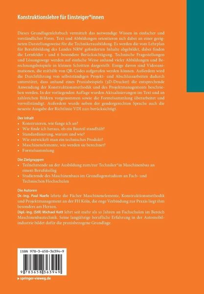 Dieses Grundlagenlehrbuch vermittelt das notwendige Wissen in einfacher und verständlicher Form. Text und Abbildungen orientieren sich dabei an einer geeigneten Darstellungsweise für die Technikerausbildung. Es werden die vom Lehrplan für Berufsbildung des Landes NRW geforderten Inhalte abgebildet, dabei finden die Lernfelder 1 und 6 besondere Berücksichtigung. Technische Fragestellungen und Lösungswege werden auf einfache Weise anhand vieler Abbildungen und Berechnungsbeispiele in kleinen Schritten dargestellt. Einige davon sind Videoanimationen, die auf der Verlagshomepage beim Buch über einen Link abgerufen werden können. Außerdem wird die Durchführung von selbstständigen Projekt- und Abschlussarbeiten dadurch unterstützt, dass anhand eines Praxisbeispiels (3D-Drucker) die entsprechende Anwendung der Konstruktionsmethodik und des Projektmanagements beschrieben werden.