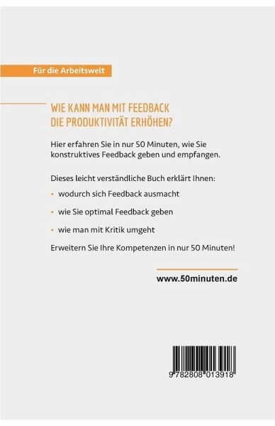 Effektiv Feedback geben und empfangen ¿ in nur 50 Minuten Suchen Sie nach den richtigen Worten, um einen Kollegen auf einen Fehler hinzuweisen? Fühlen Sie sich gekränkt, wenn Ihr Vorgesetzter Sie kritisiert? Wollen Sie Ihren Mitarbeiter loben, ohne dass er sich danach auf seinen Lorbeeren ausruht? Dann wird Ihnen dieses Buch erklären, was gelungenes Feedback ausmacht. Sie erfahren alles darüber, wie man effizient Feedback gibt ¿ von der Vorbereitung, über die Durchführung, bis zur Nachbereitung. Außerdem lernen Sie, wie konstruktives Feedback zu Ihrer Persönlichkeitsentwicklung beiträgt. Nach 50 Minuten können Sie: ¿ konstruktives Feedback geben ¿ mit negativer Kritik umgehen ¿ Ihre Leistungsfähigkeit mit Feedback steigern Starten Sie mit diesen praktischen Tipps voll durch! Über 50MINUTEN.DE Für die Arbeitswelt Was bringt Sie im Job weiter? Die Serie Für die Arbeitswelt der Reihe 50Minuten ist für alle geeignet, die sich ¿ egal auf welchem Abschnitt ihrer Karriere ¿ neue persönliche und berufliche Kompetenzen aneignen, ihr Potenzial optimal ausschöpfen oder einfach ihre Work-Life-Balance hinterfragen wollen. Unsere kompakten Titel enthalten nicht nur eine von Experten erstellte Übersicht über die relevante Theorie, sondern auch konkrete Anleitungen, die von zahlreichen Beispielen unterstützt werden. Die einfache und leicht verständliche Formulierung der komplexen Sachverhalte ist somit der ideale Ausgangspunkt für Angestellte, Arbeitgeber und Arbeitssuchende.
