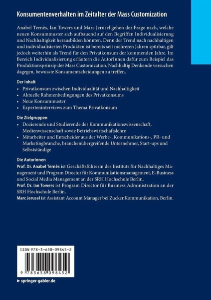 Anabel Ternès, Ian Towers und Marc Jerusel gehen der Frage nach, welche neuen Konsummuster sich aufbauend auf den Begriffen Individualisierung und Nachhaltigkeit herausbilden könnten. Denn der Trend nach nachhaltigen und individualisierten Produkten ist bereits seit mehreren Jahren spürbar, gilt jedoch weiterhin als Trend für den Privatkonsum der kommenden Jahre. Im Bereich Individualisierung erläutern die AutorInnen dafür zum Beispiel das Produktionsprinzip der Mass Customization. Nachhaltig Denkende versuchen dagegen, bewusste Konsumentscheidungen zu treffen.