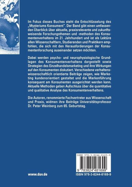 1. Psychophysiologische Grundlagen des Konsumentenverhaltens.- Der Einfluss des Unbewussten auf das Konsumentenverhalten.- Aktivierungsforschung und Konsumentenverhalten.- Mensch und Marke - Neuromarketing als Zugang zur Erfassung der Wirkung von Marken.- State of the Art der Imagery-Forschung und ihre Bedeutung für den Handel.- 2. Konsumentenverhalten im Handel.- Die Entstehung des Preisimage von Handelsbetrieben.- Sortimentsdiversifikation im Handel - Eine theoretische und empirische Analyse.- Erwartungen von Konsumenten gegenüber dem persönlichen Verkauf.- Möglichkeiten der Beeinflussung des Konsumenten in Einkaufsstätten in Abhängigkeit von Kundentypen und Einkaufsstättendeterminanten - unter Berücksichtigung von machttheoretischen und einstellungstheoretischen Aspekten.- Marke oder Eigen- (Handels-)marke? - Erfolgreiche Strategien für Markenartikler.- 3. Beiträge der Konsumentenverhaltensforschung zum kundenorientierten Marketing.- Wege zur Kundenkenntnis.- Relationship Marketing in Konsumgütermärkten - Grundlagen des Relationship Marketing und Strukturierungsoptionen für den Instrumenteneinsatz des Anbieters.- Kundenempfehlungen als Marketinginstrument.- Informationsrecht und Informationsverhalten der Konsumenten - zentrale Bedingungen eines nachhaltigen Konsums.- Emotionale Gestaltung der Werbung für Investmentfonds: Die Affekt-Heuristik bei der Risiko-Rendite-Wahrnehmung privater Kapitalanleger.- Produktivfaktor Vertrauen - Neue Anforderungen an die Öffentlichkeitsarbeit von und in Unternehmen im Zeitalter der E-Mail-Kömmunikation.- Sozialtechnische Gestaltung der Ästhetik von Produktverpackungen.- Markenlust durch strategische Dufterlebnisse.- Aufbau und Anwendung von Absatzsegmentsystemen.- 4. Methodische Beiträge zurKonsumentenverhaltensforschung.- 4.1 Positivistisch orientierte Forschung.- Nutzen und Einstellung. Über ein (?) Konstrukt der Theorie des Konsumentenverhaltens.- Prozessverfolgende Conjoint Analyse: Neue Möglichkeiten der Analyse des Informations- und Entscheidungsverhaltens von Konsumenten.- Messung von Designwirkungen bei Automobilen - Eine Conjoint-Studie mit Fotomontagen.- Strukturgleichungsmodelle für die Konsumentenverhaltensforschung - Methodische Trends und Softwareentwicklungen.- Ökonomische Laborexperimente und Konsumentenverhalten.- 4.2 Post-positivistisch orientierte Forschung.- Grüße aus dem Jenseits - Sterblichkeit und Marketing.- Publikationen von Prof. Dr. Peter Weinberg.- Autorenverzeichnis.- Stichwortverzeichnis.