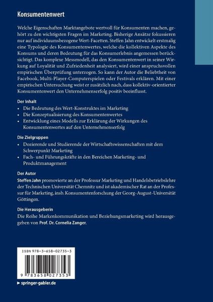 Was macht Marktangebote wertvoll für Konsumenten - diese Frage gehört zu den wichtigsten im Marketing. Bisherige Ansätze sind jedoch einseitig und fokussieren nur auf Individuum-bezogene Wert-Facetten. Steffen Jahn entwickelt eine Typologie des Konsumentenwertes, die erstmalig die kollektiven Asnpekte des Konsums und deren Bedeutung für das Konsumerlebnis angemessen berücksichtigt. Die Arbeit ermöglicht damit, die Beliebtheit von Facebook, Multi-Player-Computerspielen oder Festivals besser zu erklären. Eine empirische Untersuchung weist zusätzlich nach, dass kollektiv-orientierter Konsumentenwert den Unternehmenserfolg positiv beeinflusst. Damit leistet die Dissertation einen Beitrag sowohl für Marketingwissenschaft als auch -praxis.