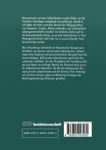 Konsummuster privater Lebensformen wurden bisher von der (Familien-)Soziologie weitgehend vernachlässigt, obwohl es sich dabei um einen zentralen Bereich der Alltagsgestaltung von Ehepaaren, Singles, Alleinerziehenden und nichtehelichen Lebensgemeinschaften handelt. Ein ähnliches Defizit gilt für die Konsumentenforschung, wo private Lebensformen in ihrer Heterogenität bisher nicht oder nur in unzureichender Form berücksichtigt werden. Doris Rosenkranz entwickelt ein theoretisches Konzept zum Verhältnis von Konsum und privaten Lebensformen. Anhand empirischer Analysen und praxisorientierter Beispiele kann die Autorin belegen, daß private Lebensformen spezifische Konsummuster ausbilden. Aus der Perspektive der Familiensoziologie wird damit ein wichtiger Bereich der Binnenstruktur privater Lebensformen beleuchtet. Die Berücksichtigung des Konzepts privater Lebensformen und die Kenntnis ihrer heterogenen Struktur können zudem im Marketing Strategien der Marktsegmentierung effizientergestalten.