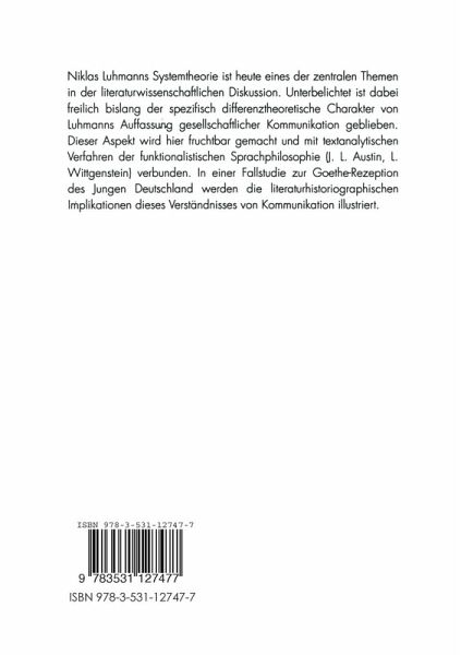 Niklas Luhmanns Systemtheorie ist heute eines der zentralen Themen in der literaturwissenschaftlichen Diskussion. Unterbelichtet ist dabei freilich bislang der spezifisch differenztheoretische Charakter von Luhmanns Auffassung gesellschaftlicher Kommunikation geblieben. Dieser Aspekt wird hier fruchtbar gemacht und mit textanalytischen Verfahren der funktionalistischen Sprachphilosophie (J. L. Austin, L. Wittgenstein) verbunden. In einer Fallstudie zur Goethe-Rezeption des Jungen Deutschland werden die literaturhistoriographischen Implikationen dieses Verständnisses von Kommunikation illustriert.
