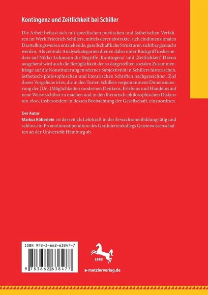 Die Arbeit befasst sich mit spezifischen poetischen und ästhetischen Verfahren im Werk Friedrich Schillers, mittels derer abstrakte, sich eindimensionalen Darstellungsweisen entziehende, gesellschaftliche Strukturen sichtbar gemacht werden. Als zentrale Analysekategorien dienen dabei unter Rückgriff insbesondere auf Niklas Luhmann die Begriffe 'Kontingenz' und 'Zeitlichkeit'. Davon ausgehend wird auch die Bezüglichkeit der so dargestellten sozialen Zusammenhänge auf die Konstituierung moderner Subjektivität in Schillers historischen, ästhetisch-philosophischen und literarischen Schriften nachgezeichnet. Ziel dieses Vorgehens ist es, die in den Texten Schillers vorgenommene Dimensionierung der (Un-)Möglichkeiten modernen Denkens, Erlebens und Handelns auf neue Weise sichtbar zu machen und in den literarisch-philosophischen Diskurs um 1800, insbesondere in dessen Beobachtung der Gesellschaft, einzuordnen.