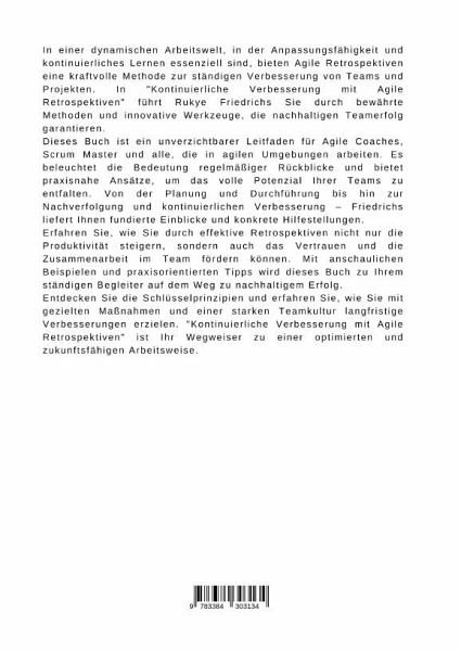 In einer dynamischen Arbeitswelt, in der Anpassungsfähigkeit und kontinuierliches Lernen essenziell sind, bieten Agile Retrospektiven eine kraftvolle Methode zur ständigen Verbesserung von Teams und Projekten. In "Kontinuierliche Verbesserung mit Agile Retrospektiven" führt Rukye Friedrichs Sie durch bewährte Methoden und innovative Werkzeuge, die nachhaltigen Teamerfolg garantieren.Dieses Buch ist ein unverzichtbarer Leitfaden für Agile Coaches, Scrum Master und alle, die in agilen Umgebungen arbeiten. Es beleuchtet die Bedeutung regelmäßiger Rückblicke und bietet praxisnahe Ansätze, um das volle Potenzial Ihrer Teams zu entfalten. Von der Planung und Durchführung bis hin zur Nachverfolgung und kontinuierlichen Verbesserung - Friedrichs liefert Ihnen fundierte Einblicke und konkrete Hilfestellungen.Erfahren Sie, wie Sie durch effektive Retrospektiven nicht nur die Produktivität steigern, sondern auch das Vertrauen und die Zusammenarbeit im Team fördern können. Mit anschaulichen Beispielen und praxisorientierten Tipps wird dieses Buch zu Ihrem ständigen Begleiter auf dem Weg zu nachhaltigem Erfolg.Entdecken Sie die Schlüsselprinzipien und erfahren Sie, wie Sie mit gezielten Maßnahmen und einer starken Teamkultur langfristige Verbesserungen erzielen. "Kontinuierliche Verbesserung mit Agile Retrospektiven" ist Ihr Wegweiser zu einer optimierten und zukunftsfähigen Arbeitsweise.