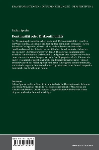 Der Neuanfang der westdeutschen Justiz nach 1945 war tatsächlich vor allem ein Wiederaufbau. Doch hatte die Rechtspflege damit nicht schon eine »zweite Schuld« auf sich geladen, ehe sie sich nach demokratischen Maßstäben bewähren konnte? Am Beispiel des westfälischen Anwaltsnotariats beleuchtet das Buch den Übergangsprozess von der NS-Diktatur zur Bundesrepublik zwischen Kontinuität und Diskontinuität und geht so dem komplexen Problem unter einer veränderten Perspektive nach. Die Biographien aller 515 Notare, die in den ersten Nachkriegsjahren im Oberlandesgerichtsbezirk Hamm (wieder)ernannt wurden, hat Fabian Spreier vor diesem Hintergrund ebenso untersucht, wie Veränderungen in berufsständischen Organisationen oder Entwicklungen im Berufsrecht der Anwälte und Notare.