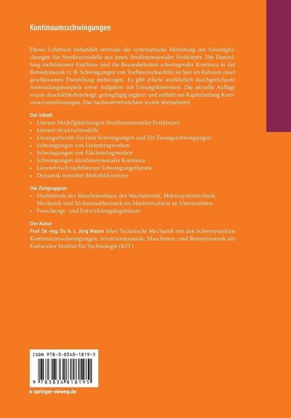Dieses Lehrbuch behandelt erstmals die systematische Herleitung der Grundgleichungen für Strukturmodelle aus jenen dreidimensionaler Festkörper. Die Darstellung nichtlinearer Einflüsse und die Besonderheiten schwingender Kontinua in der Rotordynamik, z. B. Schwingungen von Turbinenschaufeln ist hier einbezogen. Etliche ausführlich durchgerechnete Anwendungsbeispiele sowie Aufgaben mit Lösungshinweisen stärken das Verständnis. Die aktuelle Auflage wurde druckfehlerbereinigt, an einigen Stellen ergänzt und enthält am Kapitelanfang Kurzzusammenfassungen. Das Sachwortverzeichnis wurde erweitert.