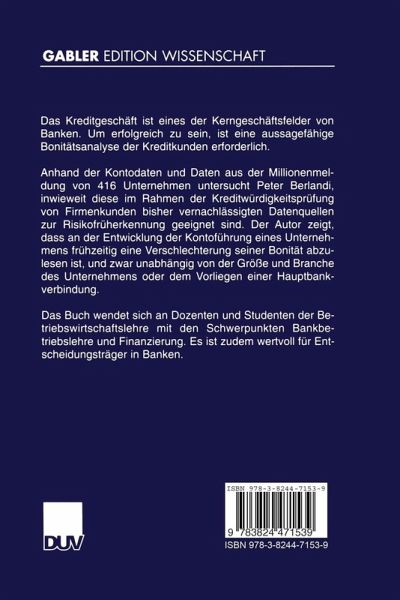 Anhand der Kontodaten und Daten aus der Millionenmeldung von 416 Unternehmen untersucht Peter Berlandi, inwieweit diese im Rahmen der Kreditwürdigkeitsprüfung von Firmenkunden bisher vernachlässigten Datenquellen zur Risikofrüherkennung geeignet sind. Der Autor zeigt, dass an der Entwicklung der Kontoführung eines Unternehmens frühzeitig eine Verschlechterung seiner Bonität abzulesen ist, und zwar unabhängig von der Größe und Branche des Unternehmens oder dem Vorliegen einer Hauptbankverbindung.