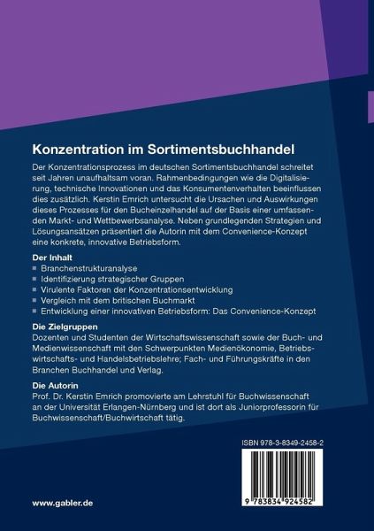 Der Konzentrationsprozess im deutschen Sortimentsbuchhandel schreitet seit Jahren unaufhaltsam voran. Rahmenbedingungen wie die Digitalisierung, technische Innovationen und das Konsumentenverhalten beeinflussen dies zusätzlich. Kerstin Emrich untersucht die Ursachen und Auswirkungen dieses Prozesses für den Bucheinzelhandel auf der Basis einer umfassenden Markt- und Wettbewerbsanalyse. Neben grundlegenden Strategien und Lösungsansätzen präsentiert die Autorin mit dem Convenience-Konzept eine konkrete, innovative Betriebsform.