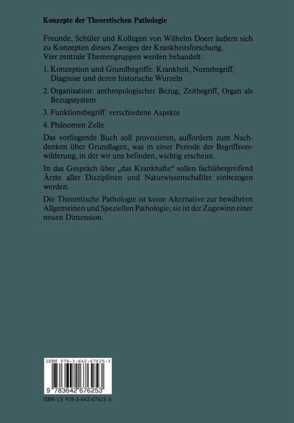 Laudatio auf Wilhelm Doerr.- Sektion I: Konzeption der Grundbegriffe.- Einführung des Moderators.- Präliminarien einer Theoretischen Pathologie.- Normbegriff.- Krankheitsbegriff.- Diagnosebegriff.- Heterotopie und Heterochronie als durchgängige Prinzipien einer Anthropologie des Krankhaften.- Diskussion.- Sektion II: Organisation.- Einführung des Moderators.- Bezugssystem Mensch.- Bezugssystem Zeit.- Bezugssystem Organ.- Homologe Einrichtungen unter dem Aspekt einer Theoretischen Pathologie.- Diskussion.- Sektion III: Funktion.- Einführung des Moderators.- Ansatzpunkte einer theoretischen Pathologie des Kreislaufs.- Regulierende Systeme.- Funktionsprinzipien des endokrinen Systems.- Zusammenfassung des Moderators.- Diskussion.- Sektion IV: Das Phänomen Zelle.- Einführung des Moderators.- Zellregulation.- Pathophysik.- Pathochemie.- Sektion V: Schlußbetrachtungen.- Theoretische Pathologie als Matrix einer modernen Grundlagenforschung.- Schlußwort.