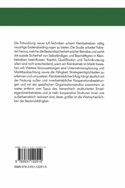Die Entwicklung neuer IuK-Techniken scheint Kleinbetrieben völlig neuartige Existenzbedingungen zu bieten. Die Studie arbeitet heraus, welche die Bestandssicherheit solcher Betriebe und somit die soziale Sicherheit von Selbständigen und Beschäftigten in Kleinbetrieben beeinflussen.