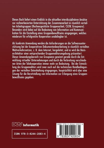 Dieses Buch liefert einen Einblick in die aktuellen interdisziplinären Ansätze zur rechnerbasierten Unterstützung der Zusammenarbeit in räumlich verteilten Arbeitsgruppen (Rechnergestützte Gruppenarbeit, CSCW, Groupware). Besonders wird dabei auf die Bedeutung von Information und Kommunikation für die Einstellung eines Gruppenbewußtseins eingegangen, welches wiederum für erfolgreiche Kooperation unabdingbar ist. Als konkrete Anwendung werden die Anforderungen an die Softwareunterstützung bei der kooperativen Dokumentenbearbeitung in räumlich verteilten Weitverkehrsnetzen, z. B. dem Internet, hergeleitet, und es wird die Basisarchitektur einer entsprechenden Gruppeneditorumgebung präsentiert. Dieser Anwendungsbereich von Groupware gewinnt gerade durch die Entwicklung virtueller Unternehmungen und durch die Verbreitung verschiedener Arten der Telekooperation immer mehr an Bedeutung. Bei der Entwicklung des Gruppeneditors wird zwar auch auf die technischen Randbedingungen der verteilten Datenhaltung eingegangen, hauptsächlich wird aber eine Lösung für die Bereitstellung von Information zur Erlangung eines Gruppenbewußtseins gegeben.
