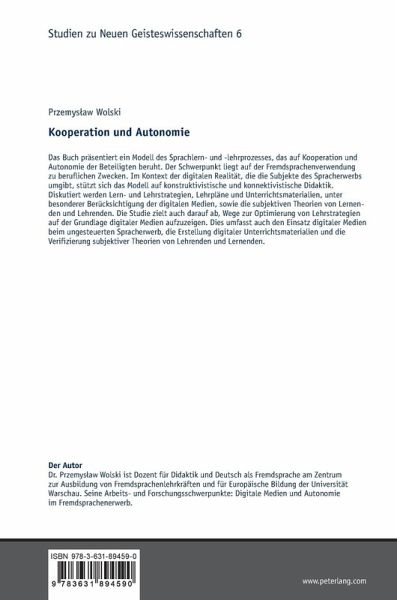 Das Buch präsentiert ein Modell des Sprachlern- und -lehrprozesses, das auf Kooperation und Autonomie der Beteiligten beruht. Der Schwerpunkt liegt auf der Fremdsprachenverwendung zu beruflichen Zwecken. Im Kontext der digitalen Realität, die die Subjekte des Spracherwerbs umgibt, stützt sich das Modell auf konstruktivistische und konnektivistische Didaktik. Diskutiert werden Lern- und Lehrstrategien, Lehrpläne und Unterrichtsmaterialien, unter besonderer Berücksichtigung der digitalen Medien, sowie die subjektiven Theorien von Lernenden und Lehrenden. Die Studie zielt auch darauf ab, Wege zur Optimierung von Lehrstrategien auf der Grundlage digitaler Medien aufzuzeigen. Dies umfasst auch den Einsatz digitaler Medien beim ungesteuerten Spracherwerb, die Erstellung digitaler Unterrichtsmaterialien und die Verifizierung subjektiver Theorien von Lehrenden und Lernenden.