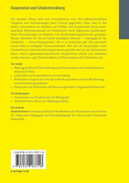 Die einzelne Schule sieht sich verschiedenen, zum Teil widersprüchlichen Vorgaben und Anforderungen ihrer Umwelt gegenüber. Diese sind in den letzten Jahrzehnten im Hinblick auf Vielfalt und Komplexität durch kontinuierliche Reformansprüche im Schulbereich sowie allgemeiner gesellschaftlicher Entwicklungen im Rahmen von Modernisierungsprozessen gestiegen. Daraus entstehen für die an Schule beteiligten Akteure -vorrangig für die Lehrkräfte - Entwicklungsanlässe, die es zu bearbeiten gilt. Dies geschieht immer öfter in kollegialer Zusammenarbeit. Wie sich die Kooperation unter Lehrkräften in Schulentwicklungsprozessen gestaltet und wie die Erkenntnisse hierzu durch organisationstheoretische Perspektiven erklärt und diskutiert werden können, zeigt Elisabeth Baum auf Basis empirischer Fallstudien auf.