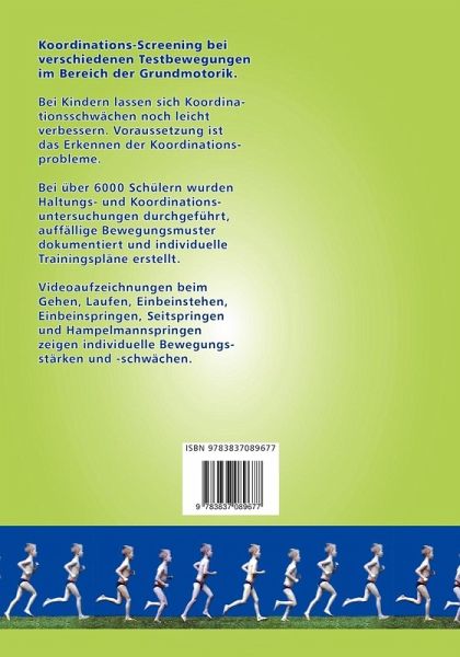 Koordinations-Screening bei verschiedenen Testbewegungen im Bereich der Grundmotorik.Bei Kindern lassen sich Koordinationsschwächen noch leicht verbessern.Voraussetzung ist das Erkennen der Koordinationsprobleme. Bei über 6000 Schülern wurden Haltungs- und Koordinationsuntersuchungen durchgeführt, auffällige Bewegungsmuster dokumentiert und individuelle Trainingspläne erstellt.Videoaufzeichnungen beim Gehen, Laufen, Einbeinstehen, Einbeinspringen, Seitspringen und Hampelmannspringen zeigen Bewegungsstärken und Schwächen der Kinder.