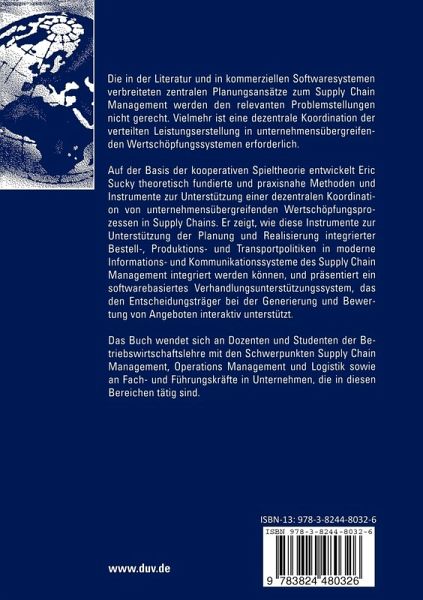 Auf der Basis der kooperativen Spieltheorie entwickelt Eric Sucky theoretisch fundierte und praxisnahe Methoden und Instrumente zur Unterstützung einer dezentralen Koodination von unternehmensübergreifenden Wertschöpfungsprozessen in Supply Chains. Er zeigt, wie diese Instrumente zur Unterstützung der Planung und Realisierung integrierter Bestell-, Produktions- und Transportpolitiken in moderne Informations- und Kommunikationssysteme des Supply Chain Management integriert werden können, und präsentiert ein softwarebasiertes Verhandlungsunterstützungssystem, das den Entscheidungsträger bei der Generierung und Bewertung von Angeboten interaktiv unterstützt.