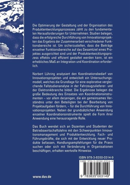 Norbert Lühring analysiert den Koordinationsbedarf von Innovationsprojekten und entwickelt ein Untersuchungsmodell, welches die Grundlage für eine explorative vergleichende Fallstudienanalyse in der Fahrzeugzulieferer- und der Elektronikbranche bildet. Die Ergebnisse belegen die große Bedeutung des Einsatzes von Koordinationsinstrumenten - vor allem derjenigen, die ein gemeinsames Verständnis unter den Beteiligten bei der Bearbeitung von Projektaufgaben fördern, - für die Durchführung von Innovationsprojekten. Neben der grundsätzlichen Anwendung einzelner Koordinationsinstrumente spielt die Form ihrer Anwendung eine herausragende Rolle.
