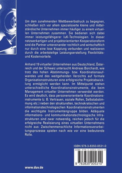 Anhand 19 virtueller Unternehmen aus Deutschland, Österreich und der Schweiz untersucht Andreas Borchardt, wie trotz des hohen Abstimmungs- bzw. Koordinationsaufwandes und des weitgehenden Verzichts auf formale Organisationsstrukturen eine erfolgreiche Projektabwicklung ermöglicht werden kann. Im Mittelpunkt stehen unterschiedliche Koordinationsinstrumente, die beim Management virtueller Unternehmen verwendet werden. Es wird deutlich, dass personenorientierte Koordinationsinstrumente (z. B. Vertrauen, soziale Rollen, Selbstabstimmung etc.) neben den strukturellen, technokratischen und informationstechnologischen Koordinationsinstrumenten die wichtigste Instrumentengruppe bilden. Adäquate informations- und kommunikationstechnologische Infrastrukturen sind zwar notwendig, reichen jedoch für die erfolgreiche Realisierung eines virtuellen Unternehmens nicht aus: Zwischenmenschliche Informationsverarbeitungsprozesse spielen nach wie vor eine bedeutende Rolle.