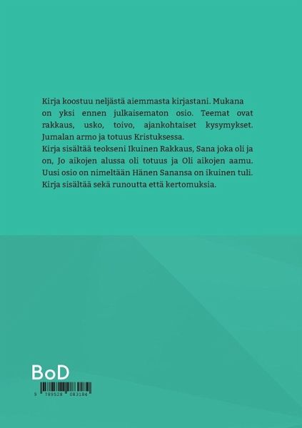 Kirja koostuu neljästä aiemmasta kirjastani. Mukana on yksi ennen julkaisematon osio. Teemat ovat rakkaus, usko, toivo, ajankohtaiset kysymykset. Jumalan armo ja totuus Kristuksessa. Kirja sisältää teokseni Ikuinen Rakkaus, Sana joka oli ja on, Jo aikojen alussa oli totuus ja Oli aikojen aamu. Uusi osio on nimeltään Hänen Sanansa on ikuinen tuli. Kirja sisältää sekä runoutta että kertomuksia.