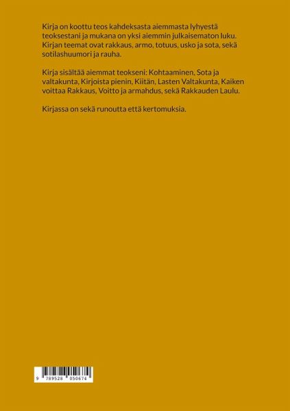Kirja on koottu teos kahdeksasta aiemmasta lyhyestä teoksestani ja mukana on yksi aiemmin julkaisematon luku. Kirjan teemat ovat rakkaus, armo, totuus, usko ja sota, sekä sotilashuumori ja rauha. Kirja sisältää aiemmat teokseni: Kohtaaminen, Sota ja valtakunta, Kirjoista pienin, Kiitän, Lasten Valtakunta, Kaiken voittaa Rakkaus, Voitto ja armahdus, sekä Rakkauden Laulu. Kirjassa on sekä runoutta että kertomuksia.