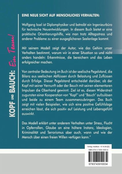 Eine neue Sicht auf menschliches Verhalten: Wolfgang Issel ist Diplomphysiker und betreibt ein Ingenieurbüro für technische Neuentwicklungen. In diesem Buch bietet er eine praktische Orientierungshilfe, wie man trotz Alltagsstress und anderer Probleme zu einer ausgeglichenen Seelenlage kommt. Mit seinem Modell zeigt der Autor, wie das Gehirn unser Verhalten bestimmt, warum wir in einer Situation so und nicht anders handeln: Erkenntnisse, die bereichern und das Leben erfolgreicher machen. Von zentraler Bedeutung im Buch ist der seelische Pegelstand, die Bilanz aus seelischen Abflüssen durch Belastung und Zuflüssen durch Erfolge. Dieser Pegelstand entscheidet darüber, ob der Kopf mit seiner Vernunft oder der Bauch mit seinen elementaren Impulsen die Oberhand gewinnt. Ziel ist es, diesen Widerstreit zugunsten einer Kooperation von "Kopf" und "Bauch" aufzulösen und beide zu einem Team zusammenzubringen. Das Buch zeigt mit vielen Beispielen, wie sich eine positive Gefühlslage erreichen lässt, die sich positiv auf Leistung und Lebensgefühl auswirkt. Das Modell erklärt unter anderem Verhalten unter Stress, Flucht in Opferrollen, Glaube an eine höhere Instanz, Ideologien, Kriminalität und Terrorismus aber auch, wann und wie der Mensch über einen freien Willen verfügen kann.