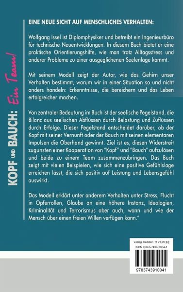 Eine neue Sicht auf menschliches Verhalten: Wolfgang Issel ist Diplomphysiker und betreibt ein Ingenieurbüro für technische Neuentwicklungen. In diesem Buch bietet er eine praktische Orientierungshilfe, wie man trotz Alltagsstress und anderer Probleme zu einer ausgeglichenen Seelenlage kommt. Mit seinem Modell zeigt der Autor, wie das Gehirn unser Verhalten bestimmt, warum wir in einer Situation so und nicht anders handeln: Erkenntnisse, die bereichern und das Leben erfolgreicher machen. Von zentraler Bedeutung im Buch ist der seelische Pegelstand, die Bilanz aus seelischen Abflüssen durch Belastung und Zuflüssen durch Erfolge. Dieser Pegelstand entscheidet darüber, ob der Kopf mit seiner Vernunft oder der Bauch mit seinen elementaren Impulsen die Oberhand gewinnt. Ziel ist es, diesen Widerstreit zugunsten einer Kooperation von "Kopf" und "Bauch" aufzulösen und beide zu einem Team zusammenzubringen. Das Buch zeigt mit vielen Beispielen, wie sich eine positive Gefühlslage erreichen lässt, die sich positiv auf Leistung und Lebensgefühl auswirkt. Das Modell erklärt unter anderem Verhalten unter Stress, Flucht in Opferrollen, Glaube an eine höhere Instanz, Ideologien, Kriminalität und Terrorismus aber auch, wann und wie der Mensch über einen freien Willen verfügen kann.