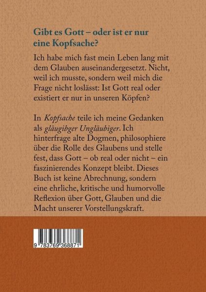 Gibt es Gott - oder ist er nur eine Kopfsache? Ich habe mich fast mein Leben lang mit dem Glauben auseinandergesetzt. Nicht, weil ich musste, sondern weil mich die Frage nicht loslässt: Ist Gott real oder existiert er nur in unseren Köpfen? In Kopfsache teile ich meine Gedanken als gläubiger Ungläubiger. Ich hinterfrage alte Dogmen, philosophiere über die Rolle des Glaubens und stelle fest, dass Gott - ob real oder nicht - ein faszinierendes Konzept bleibt. Dieses Buch ist keine Abrechnung, sondern eine ehrliche, kritische und humorvolle Reflexion über Gott, Glauben und die Macht unserer Vorstellungskraft.