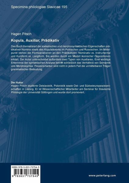Das Buch thematisiert die lexikalischen und morphosyntaktischen Eigenschaften prädikativer Nomina sowie des Kopulalexems im Polnischen und Russischen. Im Mittelpunkt stehen die Formvariationen an den Prädikativen: Nominativ vs. Instrumental und Kurzform vs. Langform. Sie werden durch ein Modell ikonischer Oppositionen erklärt. Der Autor unterscheidet außerdem zwei Typen von Auxiliaren. Eine wichtige Erkenntnis der syntaktischen Analyse betrifft schließlich das Verhältnis von Semantik und Morphosyntax: Flexionsmarker sind nicht in jedem Fall die unmittelbaren Träger grammatischer Bedeutung.