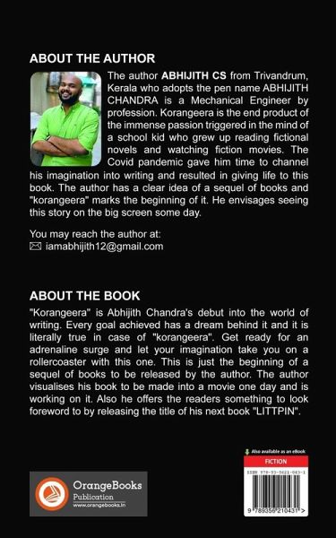 "korangeera" is Abhijith Chandra's debut into the world of writing. Every goal achieved has a dream behind it and it is literally true in case of "korangeera". Get ready for an adrenaline surge and let your imagination take you on a rollercoaster with this one. This is just the beginning of a sequel of books to be released by the author. The author visualises his book to be made into a movie one day and is working on it. Also he offers the readers something to look foreword to by releasing the title of his next book "LITTPIN".