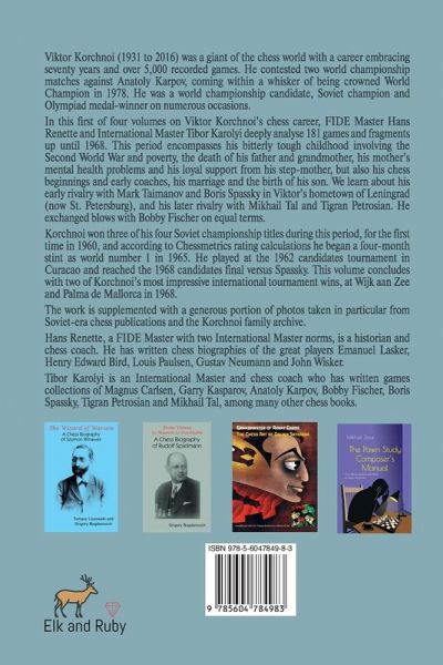 Viktor Korchnoi (1931 to 2016) was a giant of the chess world with a career embracing seventy years and over 5,000 recorded games. He contested two world championship matches against Anatoly Karpov, coming within a whisker of being crowned World Champion in 1978. He was a world championship candidate, Soviet champion and Olympiad medal-winner on numerous occasions.In this first of four volumes on Viktor Korchnoi's chess career, FIDE Master Hans Renette and International Master Tibor Karolyi deeply analyse 181 games and fragments up until 1968. This period encompasses his bitterly tough childhood involving the Second World War and poverty, the death of his father and grandmother, his mother's mental health problems and his loyal support from his step-mother, but also his chess beginnings and early coaches, his marriage and the birth of his son. We learn about his early rivalry with Mark Taimanov and Boris Spassky in Viktor's hometown of Leningrad (now St. Petersburg), and his later rivalry with Mikhail Tal and Tigran Petrosian. He exchanged blows with Bobby Fischer on equal terms.Korchnoi won three of his four Soviet championship titles during this period, for the first time in 1960, and according to Chessmetrics rating calculations he began a four-month stint as world number 1 in 1965. He played at the 1962 candidates tournament in Curacao and reached the 1968 candidates final versus Spassky. This volume concludes with two of Korchnoi's most impressive international tournament wins, at Wijk aan Zee and Palma de Mallorca in 1968.The work is supplemented with a generous portion of photos taken in particular from Soviet-era chess publications and the Korchnoi family archive.Hans Renette, a FIDE Master with two International Master norms, is a historian and chess coach. He has written chess biographies of the great players Emanuel Lasker, Henry Edward Bird, Louis Paulsen, Gustav Neumann and John Wisker.Tibor Karolyi is an International Master and chess coach who has written games collections of Magnus Carlsen, Garry Kasparov, Anatoly Karpov, Bobby Fischer, Boris Spassky, Tigran Petrosian and Mikhail Tal, among many other chess books.Check out the Elk and Ruby website for special offers on this and other books!