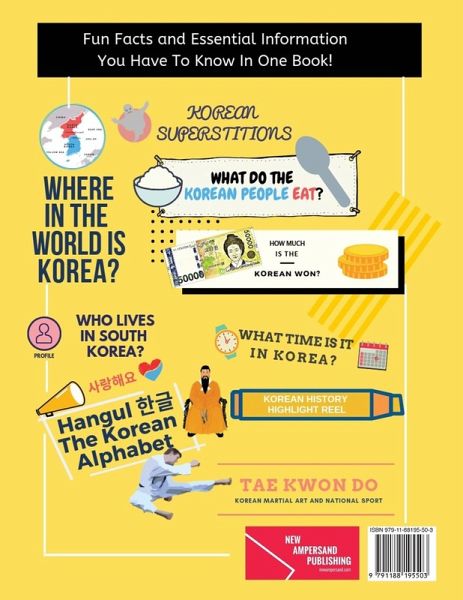 Want to learn and understand Korea in a quick and easy way? Then this book is for you! KOREA AT A GLANCE : Quick and Easy Visual Book To Help You Learn and Understand Korea is full of intuitive, easy-to-understand infographics and illustrations to help you absorb a great amount of knowledge and information in the most effective way. This book contains 52 pages of large 8.5" x 11" full-color sections, jam packed with all the essential information and facts you should know, covering various topics such as Korean History, Korean Culture, Korean Superstitions, and so much more! It's specially designed for people with no prior knowledge about Korea, and even little kids can learn easily thanks to our interesting illustrations and intuitive infographics. It also makes a great companion for your Korean study needs - the abridged highlight reel of Korean History will especially come in handy. The book has a multitude of topics and subjects, such as: Geography - WHERE IN THE WORLD IS KOREA? - HOW FAR IS KOREA? - HOW BIG IS KOREA? - WHAT TIME IS IT IN KOREA? Culture - THE KOREAN FLAG - WHAT DO ALL THE SYMBOLS MEAN? - HISTORY OF TAE GEUK GI (South Korean Flag) AND IN GONG GI (North Korean Flag) - OFFICIAL NATIONAL SYMBOLS OF KOREA - WHO LIVES IN SOUTH KOREA? - AEGUKGA - THE NATIONAL ANTHEM OF KOREA, WITH LYRICS TRANSLATION - HOLIDAYS OF KOREA - TAE KWON DO - KOREAN MARTIAL ART AND NATIONAL SPORT - KOREAN BLOOD TYPE PERSONALITY THEORY History & Tradition - HANGUL THE KOREAN ALPHABET - THE STORY BEHIND KOREAN LAST NAMES - KOREAN SUPERSTITIONS THAT MANY PEOPLE STILL BELIEVE - DOL JABI - PREDICTING BABY'S FUTURE - GUARDIANS OF KOREAN VILLAGES Food - TOP 10 ALL-TIME POPULAR KOREAN FOODS - THE EVOLUTION OF KIMCHI Economy - HOW MUCH IS THE KOREAN WON (CURRENCY)? - ECONOMY : SOUTH KOREA VS NORTH KOREA Tourism - COUNTRIES THAT DON'T NEED A VISA TO VISIT KOREA - KOREAN PLACES AND THEIR MEANINGS And there is the abridged version of Korean History, which covers not only the timeline but also have separate sections on important events and figures with full explanation and description! Korean History Highlight Reel - GOJOSEON, KOREA'S FIRST NATION - THREE KINGDOMS PERIOD - UNIFIED SILLA - GORYEO, THE GLORY OF KOREA - JOSEON DYNASTY, THE LAND OF THE MORNING CALM - DREAMING OF A MODERN STATE, THE KOREAN EMPIRE - SAD HISTORY - JAPANESE COLONIAL PERIOD - KOREAN WAR TIMELINE - POST KOREAN WAR As you can see, we've a LOT of information in this book! We're certain that you will learn a great deal with it. Have fun studying about Korea! After reading this book, you would have gained so much knowledge ;)
